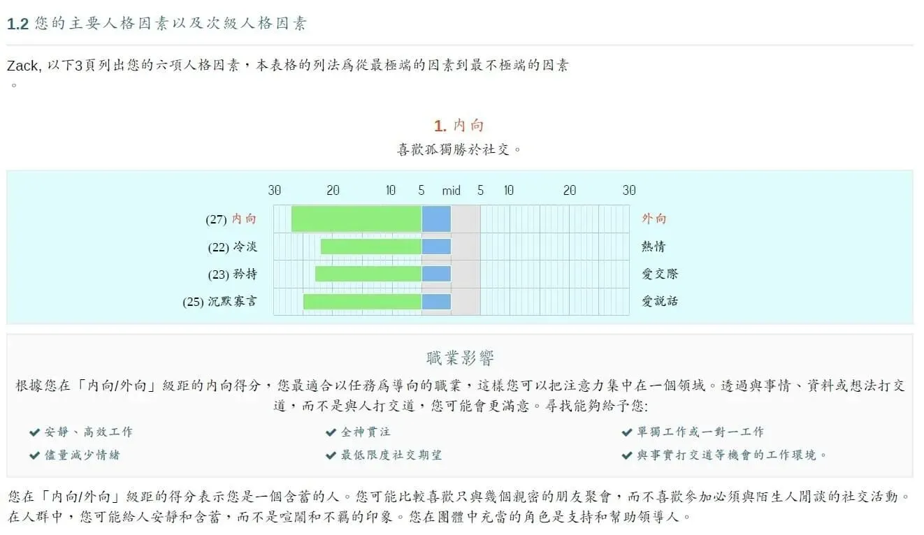 這份報告清楚地指出我的性格當中,最大的特徵就是內向、冷淡、沉默寡言、不善與人溝通,而最不適合的工作,就是需要與客戶大量社交接觸的「業務員」。