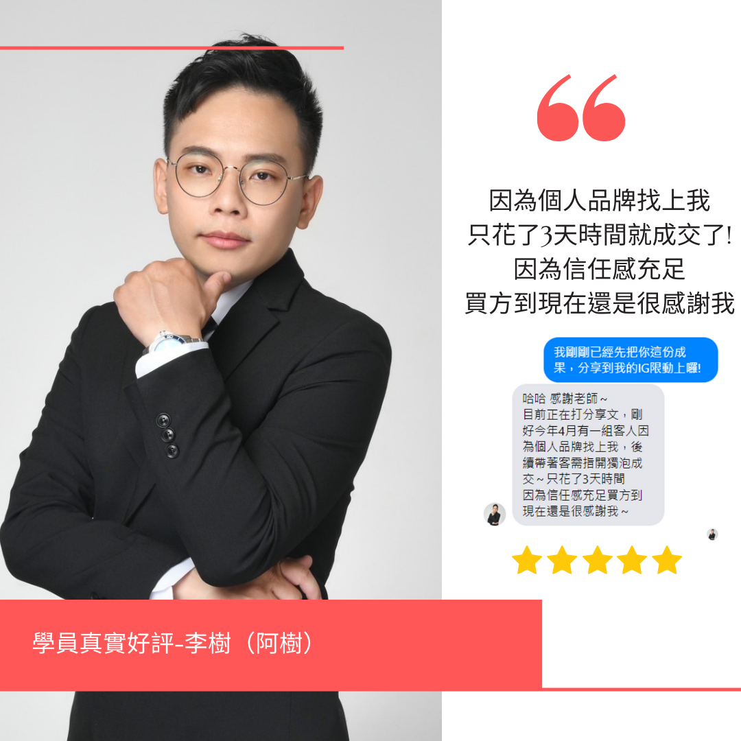 ✩知識點四|如何在時間不夠、起步比同行晚、同事也看衰你的惡劣處境下,快速打造出卓越的個人品牌,大幅提高你客源與業績翻倍的機率。